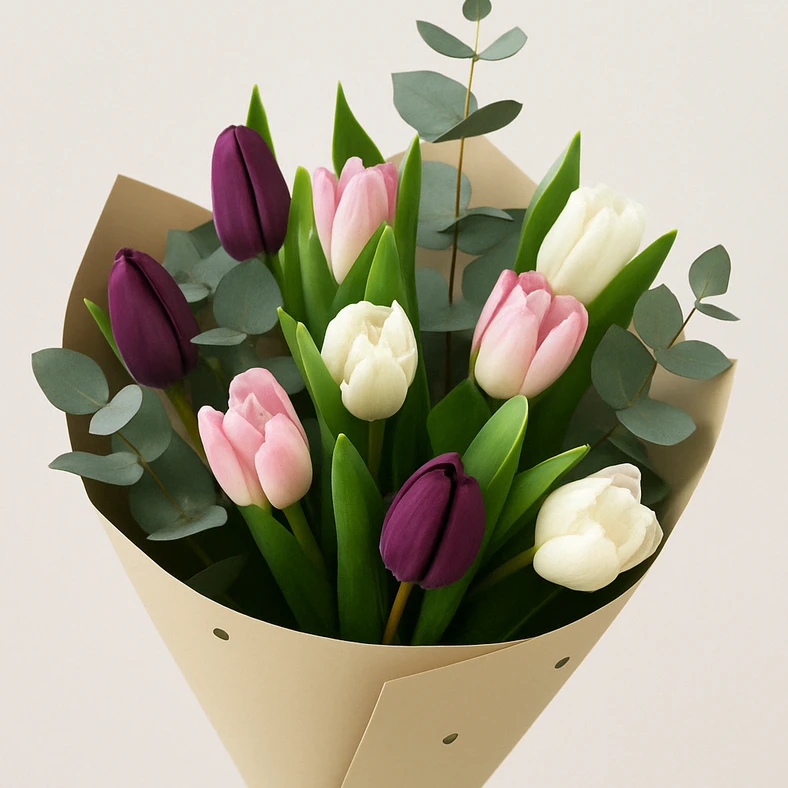 Ši išskirtinė puokštė, sudaryta iš 13 skirtingų spalvų tulpių ir subtilaus eukalipto, spinduliuoja gaivumu ir elegancija. Ryškios ir švelnios spalvos harmoningai susilieja, sukurdamos gyvybingą, bet tuo pačiu subtilią kompoziciją. Eukalipto lapai suteikia švelnų aromatą ir elegantišką žalumos akcentą, pabrėžiantį tulpių grožį. Tai puiki dovana, simbolizuojanti džiaugsmą, pavasario lengvumą ir nuoširdžius jausmus.