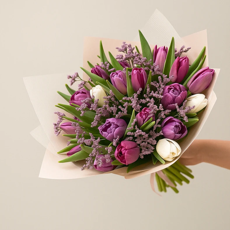 Ši švelni ir elegantiška puokštė, sudaryta iš 25 pastelinių atspalvių tulpių ir lengvo limoniumo, spinduliuoja subtilumu ir romantika. Pastelinės spalvos suteikia kompozicijai švelnumo ir harmonijos, o limoniumas prideda lengvumo ir oro gaivumo pojūtį. Tai puikus pasirinkimas norint išreikšti švelnius jausmus, džiaugsmą ir pavasarišką gaivą.