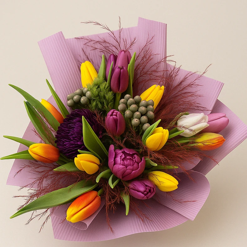 Ši gyvybinga ir nuotaikinga puokštė, sudaryta iš ryškių spalvų tulpių ir įvairių gėlių, kurios suteikia kompozicijai išskirtinį žaves... Daugiau informacijos Pristatymas Šilutės mieste — nemokamas
